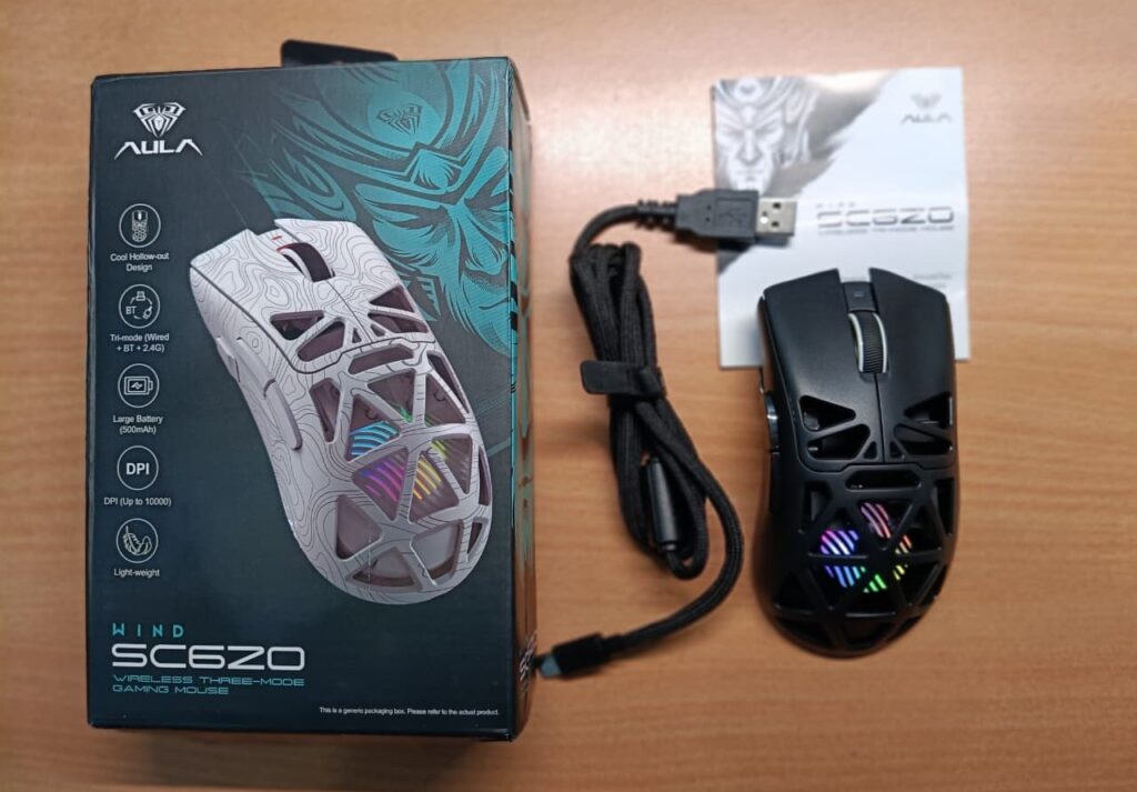 Inside the box, you’ll get the AULA SC620 Gaming Mouse itself, a premium braided USB cable (for charging and wired mode), the user manual, and the 2.4GHz wireless receiver. That’s all.