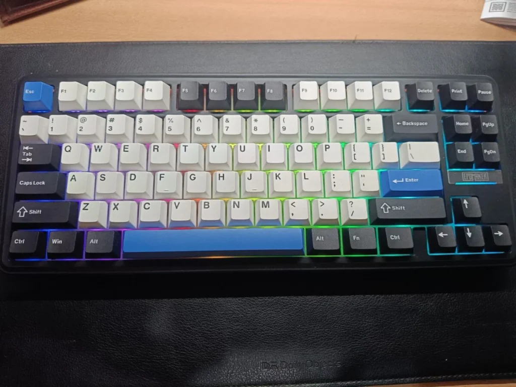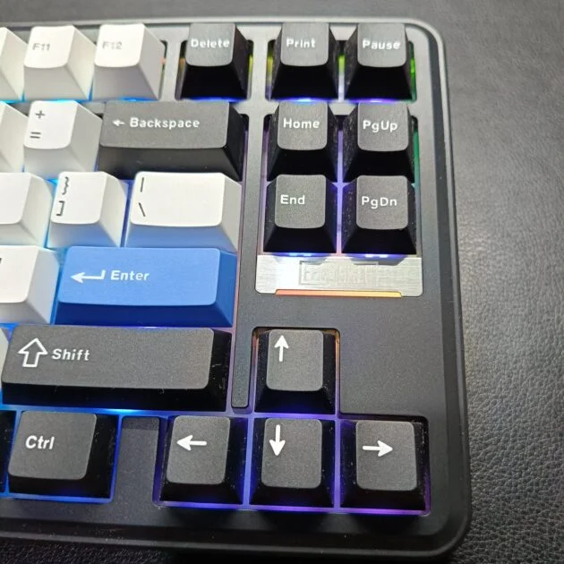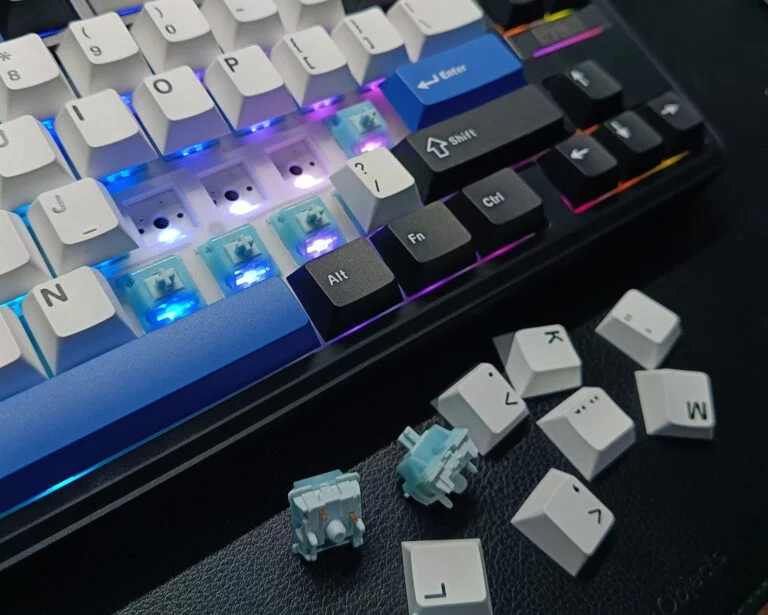 The entire chassis is made of ABS plastic. While it doesn’t have the premium weight of an aluminum keyboard, the build is surprisingly sturdy with no noticeable flex or creaking. I have the Black version with white and sky-blue accent keycaps, which creates a clean, modern aesthetic.