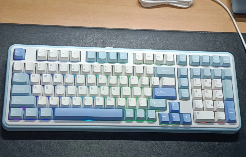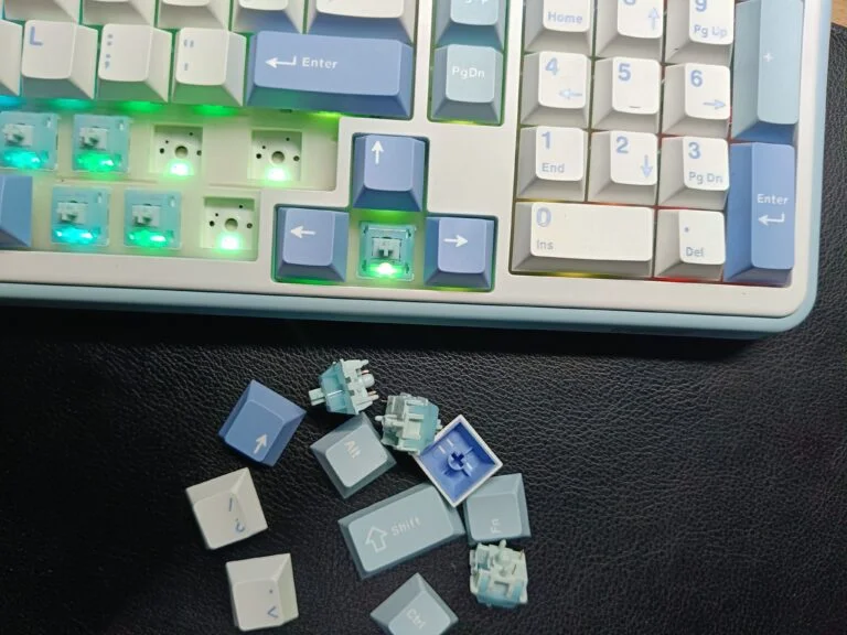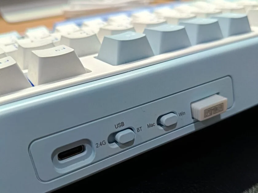 The entire case is made from a sturdy ABS plastic. While it’s not aluminum, the construction feels solid and well-executed, with no creaking or flex. I have the White-Blue version, which has a clean, retro aesthetic. On the front edge, you’ll find convenient physical switches for toggling between Windows/macOS and the three connection modes, along with the USB-C port. The 2.4GHz dongle has a dedicated storage slot, which is a great touch, though it isn’t fully recessed and sticks out slightly.