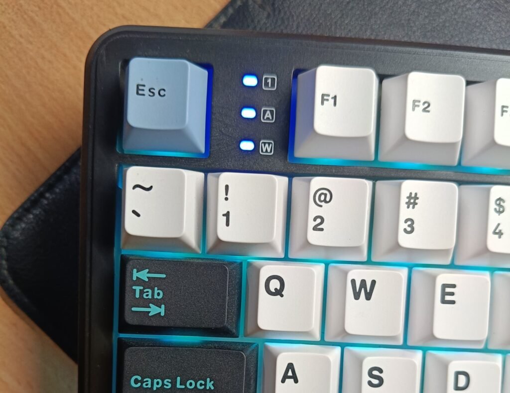 For a full-size keyboard, the F108 Pro is thoughtfully designed. The top left houses three essential indicator LEDs (Num Lock, Caps Lock, Win Lock). The front edge cleverly integrates: