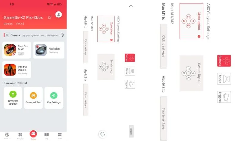 You can download the GameSir App from the Play Store. In the app, you have an explore option where you’ll find the games to download directly or from the games website. And then We have a device option in the center, which shows which controller is connected to your Android phones and the installed games. Here we also have firmware upgrade and GamePad Test Key Settings options. By clicking on the key setting, you can customize all the controls, including the ABXY layout, sticks, and triggers as well. And the game that is not pre-configured, you can configure here, like Call of Duty or other games to play.