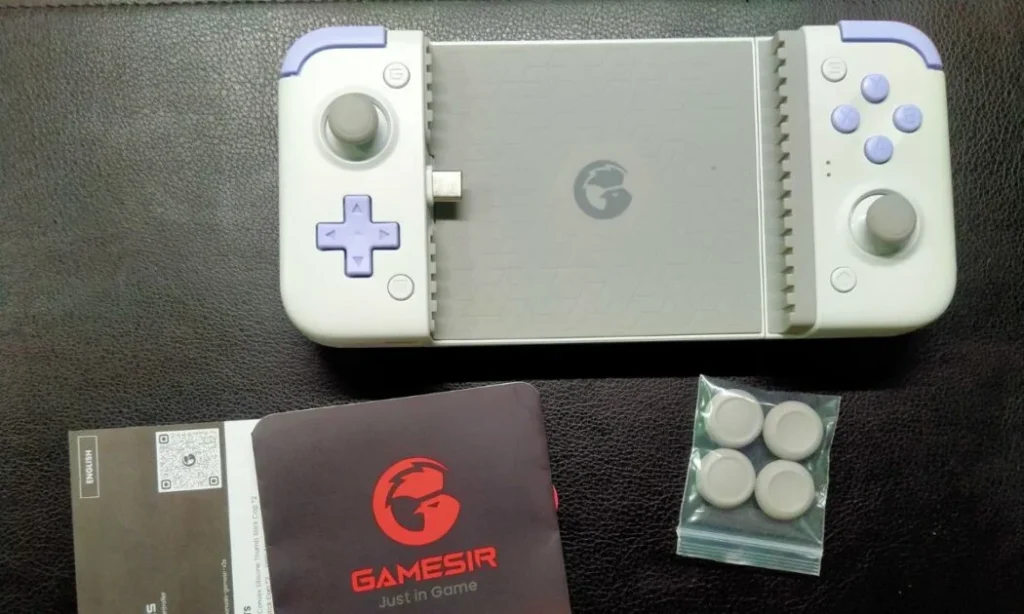 In the box, we get a user manual, warranty card, 4x sticks keycaps, and a GameSir sticker. And then we have the X2s Mobile Gaming Controller itself; that’s all we get in the box. And the box packaging not as we seen in the GameSir Galileo G8, X2s comes in a box and two separate plastic packets for documents and keycaps, or in the controller itself in the plastic packets. which I do not like.