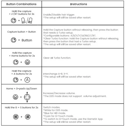Buttons Combinations: