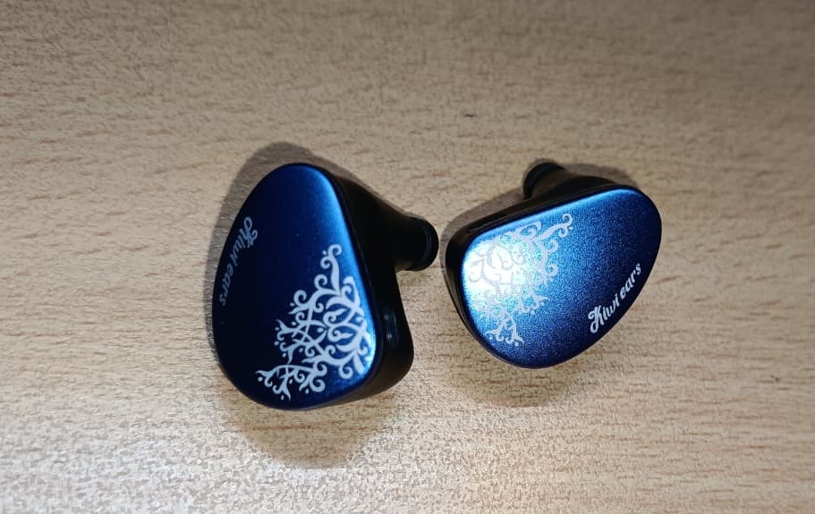 The Kiwi Ears Cadenza II features a sleek, ergonomic design that feels both premium and comfortable for extended listening sessions. The shells are crafted from a durable, lightweight material with a stunning deep blue metallic finish that shifts beautifully under light. Each faceplate is adorned with an elegant white ornate floral/scrollwork pattern, giving the IEMs a distinctive and artistic look that stands out from typical budget options. The Kiwi Ears branding is cleanly printed on the side, adding a subtle yet classy touch.