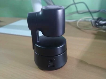 The OBSBOT Tiny 4K boasts a sturdy build and a distinctive design. On the front, it features a 4K Ultra HD lens. Below the lens, there’s an indicator LED for different statuses, dual microphones for clear voice recording, a USB-C port for device connectivity, and a DC port for power supply. Although lacking a privacy shutter, you can manually turn off the webcam by flipping the lens upside down, and reactivate it by returning it to its center position.