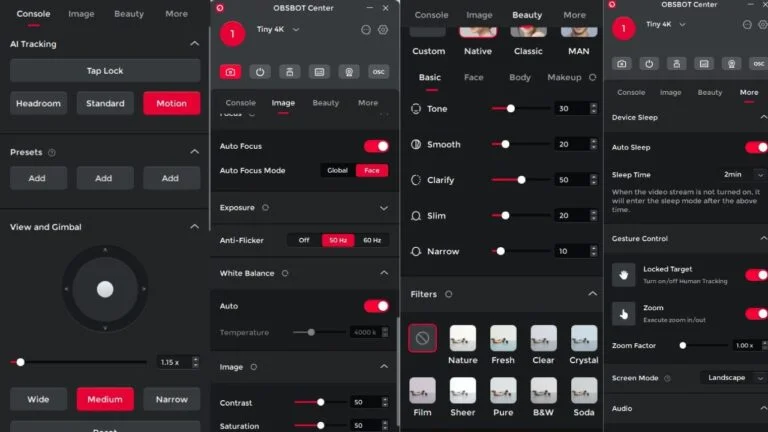 And the last option is more, where you have auto sleep timing, gesture control, turn on or off tracking, zoom-in and out, screen mode, audio options, mirror image, and pan-tilt settings. You can download and check the current firmware for the tiny 4K webcam or do a factory setting restore.
